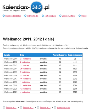 Kalendarz 2011 pozwala sprawdzić daty i kalendarz nie tyko na 2011 rok, ale również kilka lat do przodu. Na stronie głównej serwisu Kalendarz 2011 znajdziemy kalendarz na rok bieżący. Na czerwono zaznaczono najważniejsze święta i dni wolne od pracy. Klikając na przykład na 24 kwietnia 2011 zobaczymy listę dat, w których wypada Wielkanoc w najbliższych latach. Czy wiedzieliście, że Wielkanoc w 2018 wypadnie w 1 kwietnia?